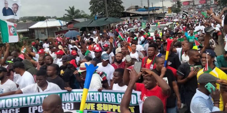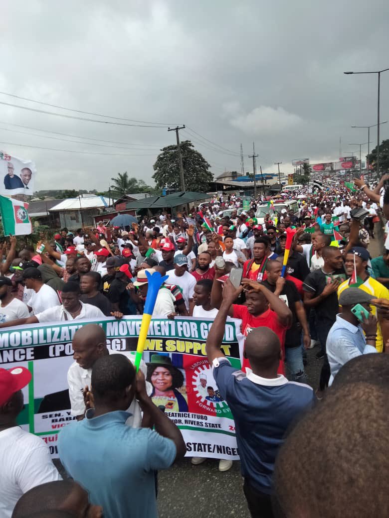 Thousands of Rivers people on Saturday defied the heavy rainfall to match on the streets of Port Harcourt in support of the Labour party Presidential candidate, Mr. Peter obi.
